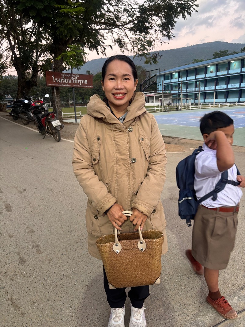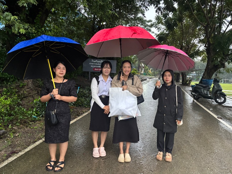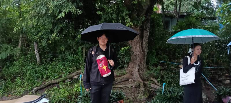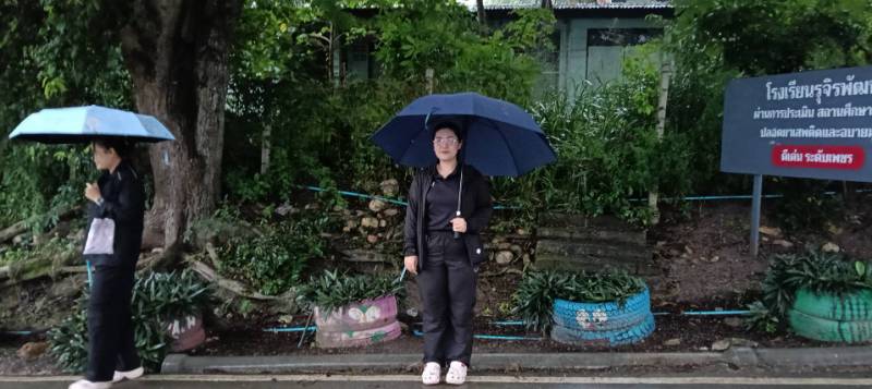 ครูเวรปฏิบัติหน้าที่ ดูแลความเรียบร้อยและตรวจกระเป๋านักเรียน สภาพอากาศเช้านี้มีฝนตก ครูพรทิพย์และครูไอลาดาลาป่วย